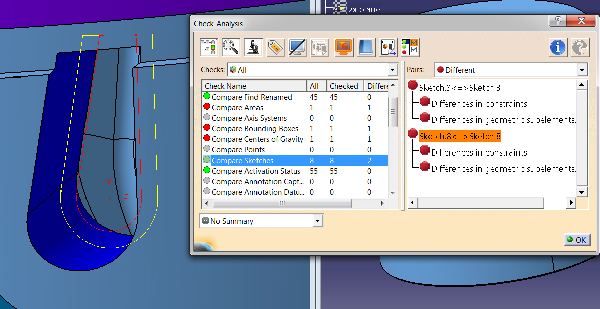 xCompare findet und dokumentiert die Abweichungen in verschiedenen Stadien von Zeichnungen, Bauteilen und Baugruppen innerhalb von CATIA oder auch im Vergleich von zwei JT-Modellen miteinander. Darüber hinaus kann auch ein CATIA-Modell seinem Pendant in JT gegenübergestellt werden. In jedem Fall werden alle Abweichungen in geometrischen Elementen sowie Änderungen von Attributen, Farben, Sketchen, Bemaßungen oder Toleranzen erkannt und deutlich gekennzeichnet. Der Vergleich wird live in CATIA oder automatisiert, z.B. im PDM-System durchgeführt. Dabei findet die Lösung in der Praxis eine breit gefächerte Anwendung vom reinen Zeichnungs- oder Geometrievergleich bis hin zur Absicherung gegen unerwünschte Änderungen bei Toleranzen.