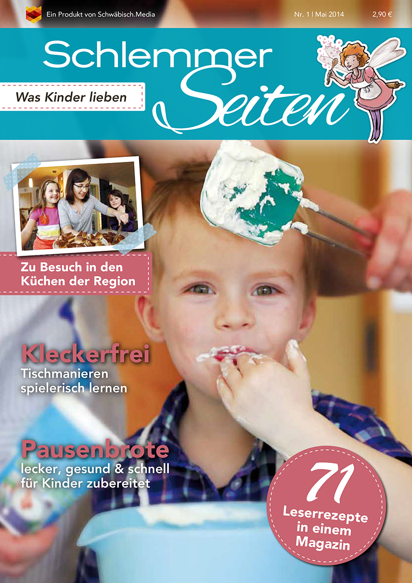 Auf 64 Seiten sind in fünf Rubriken die Lieblingsrezepte der Leserinnen und Leser der Schwäbischen Zeitung abgedruckt. Nach einem Rezeptaufruf für das Magazin erhielt die "Schlemmerseiten"-Redaktion rund 120 Rezepte. Die besten 71 finden sich im Magazin wieder. Rezeptbezogene Tipps der Rezeptfee, die durch das Magazin leitet, und Infokästen geben thematische Hintergrundinformationen. Außerdem bieten Interviews mit Ernährungsexperten und Prominenten nicht nur Unterhaltung, sondern auch kostbaren Mehrwert für Eltern. Beim Nachkochen der Rezepte entstanden zahlreiche Fotos in Zusammenarbeit mit der Food-Fotografin Karin Volz. Sie geben einen Einblick in die Schlemmerwelt der Region.