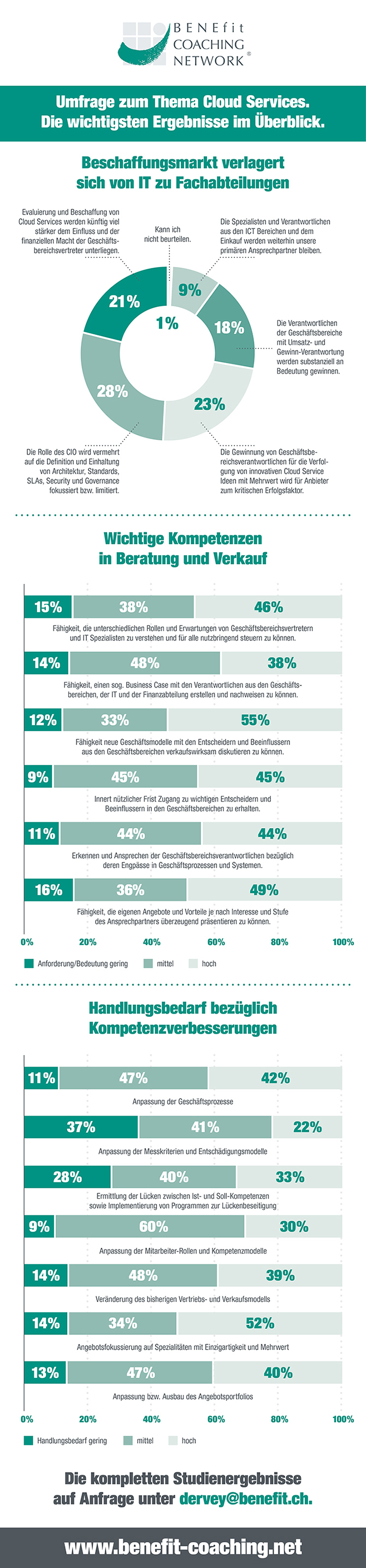 Das Schweizer BENEfit COACHING NETWORK®startete im Frühjahr eine Umfrage zum Thema Cloud-Services. Von 655 kontaktierten Schweizer Unternehmen nahmen 48 Experten auf C - Level an der Befragung teil. Befragt wurden die Experten zu den Potenzialen von Cloud-Services. Eine wichtige Erkenntnis vorneweg: An Cloud-Services führt kein Weg vorbei, sie lassen sich aber nicht wie herkömmliche Produkte ver