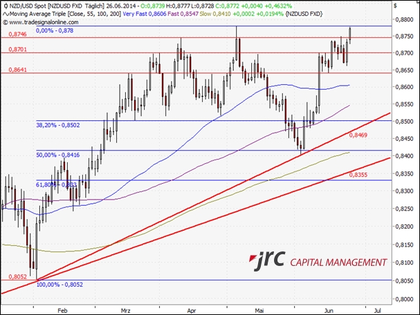 Der neuseeländische Dollar legte im Juni, ausgehend von der 0,84er-Marke, eine Rallye von über 300 Pips hin und ist inzwischen bei seinem Vormonatshoch von 0,8780 NZD/USD angekommen. Einerseits profitierte der NZD von der US-Dollar-Schwäche, andererseits von Spekulationen über weitere Leitzinserhöhungen der Reserve Bank of New Zealand. Die Official Cash Rate wurde zuletzt am 12. Juni von 3,00 auf 3,25 Prozent erhöht; für die nächste Sitzung am 24. Juli 2014 wird aufgrund der guten Konjunkturprognosen erneut eine Erhöhung erwartet.