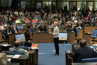 Auf dem "Mediengipfel" am ersten Konferenztag ging es um die "Zukunft des Journalismus und die Rolle der Auslandssender". Auf dem Podium auch der Nachrichtendirektor von Al Jazeera Englisch, Salah Negm, der Geschäftsführer des indischen Senders Prasar Bharati, Jawhar Sircar, und DW-Intendant Peter Limbourg.