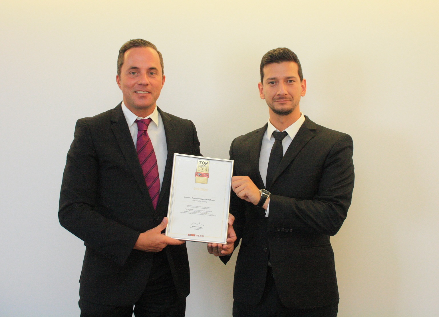 Bildunterschrift: SOLCOM Geschäftsführer Thomas Müller und Marketingleiter Zvezdan Probojcevic mit der Urkunde zum Top Personaldienstleister.