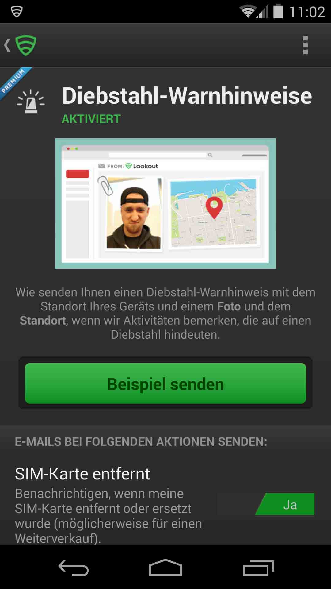 Diebe gehen stets nach einem bestimmten Schema vor: sie wollen verhindern, dass das gestohlene Smartphone angerufen oder geortet wird. Sei es durch das Entfernen der SIM-Karte oder dem Ausschalten des mobilen Gerätes. Das Lookout-Feature "Theft Alert" bemerkt diese Aktionen sofort und sendet dem Opfer innerhalb weniger Minuten eine E-Mail mit einem Foto vom Dieb und einer Karte* mit dem genauen Standort des Smartphones oder Tablets.