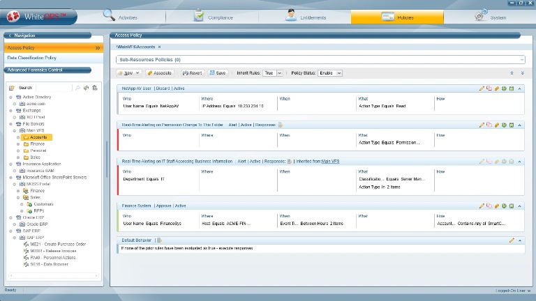 Die WhiteOPS? Plattform überwacht Zugriffe auf Dateien auf einem Dateispeicher, einem Microsoft-SharePoint und vielen weiteren Speicherorten. Auch die Überwachung der Rechteverwendung innerhalb von Unternehmensapplikationen, beispielsweise eines SAP-Systems oder anderer ERP (Enterprise-Resource-Planning)-Systeme, ist mit WhiteOPS möglich. Die hierbei gewonnenen Informationen unterstützen Firmen dabei, Zugriffsrechte zu reduzieren und damit die interne Angriffsfläche zu verkleinern. Die Rechteverwendung wird dabei in Echtzeit überwacht.