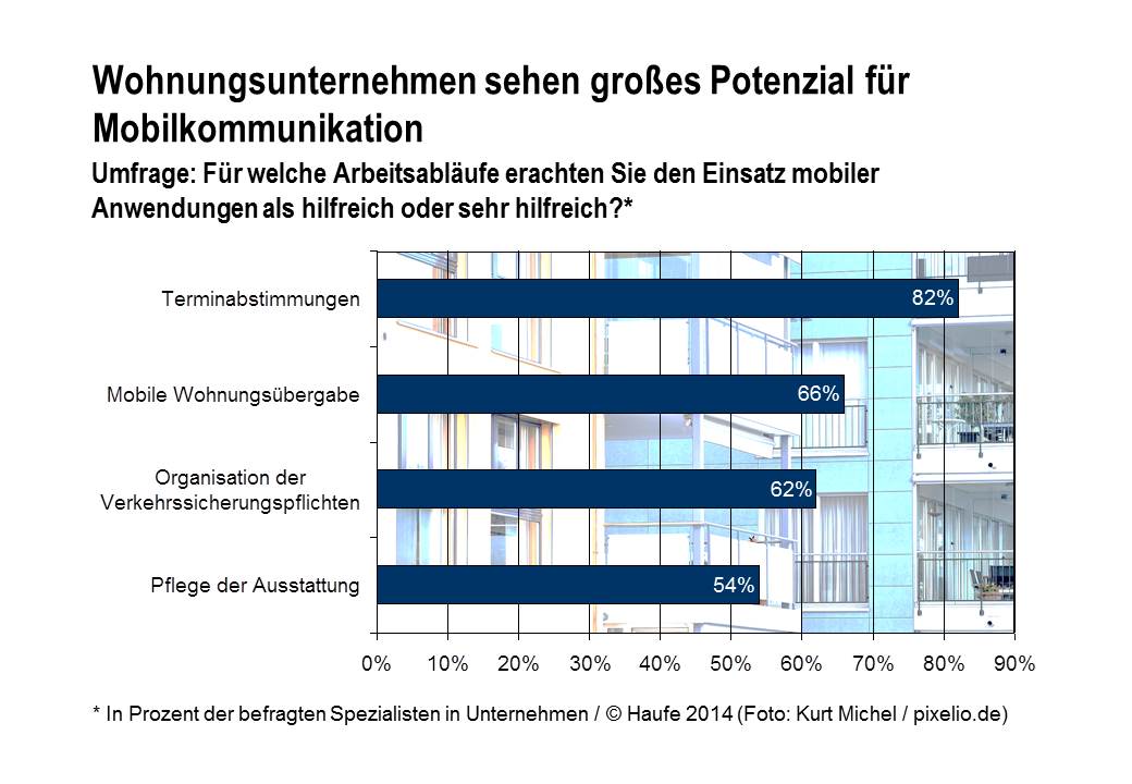 (IINews) - Freiburg, 08. Juli 2014 - Nicht nur im Privatleben, sondern auch in den Wohnungsunternehmen sind Mobilanwendungen auf dem Vormarsch: Wie eine Online-Umfrage des Software-Spezialisten Haufe (http://www.haufe.de) ergab, nutzen schon 61 Prozent der Befragten Handy oder Tablet, um Arbeitsschritte schnell und unkompliziert abzuwickeln. Bislang wird vor allem die E-Mail-Kommunikation mit den Kollegen über mobile Endgeräte geführt (59%). Mit Blick auf künftige Anwendungsbereiche hält der Großteil (82%) die mobile Terminabstimmung für hilfreich.