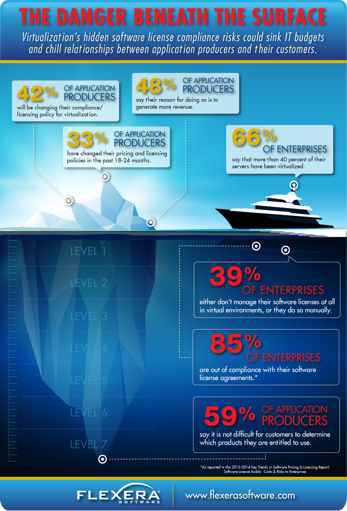 (IINews) - München, 8. Juli 2014 - Die Studie 2013-14 Key Trends in Software Pricing & Licensing Report (http://learn.flexerasoftware.com/ECM-WP-Key-Trends-Complexity-Change?utm_source=marketwire&utm_medium=PR&utm_campaign=2014PricLic2-Virt%26Compl) von Flexera Software und IDC zeigt auf, dass die Virtualisierung die Spannungen zwischen Softwareherstellern und Anwenderunternehmen verstärkt. Während Softwarewarehersteller und Hersteller von Intelligent Devices ihre Lizenzrichtlinien ändern, um von der Virtualisierung zu profitieren, versäumen es viele Unternehmen, Prozesse und Technologien zu implementieren, mit denen sie ihre virtualisierten Anwendungen verwalten können. Dadurch werden mehr Unternehmen gegen die Lizenzrichtlinien für Virtualisierung verstoßen und höhere Nachzahlungen leisten müssen. Laut Studie planen 42 Prozent der Softwarehersteller, ihre Lizenz- und Compliance-Richtlinien für Virtualisierung anzupassen. Gleichzeitig verwalten 39 Prozent der Unternehmen ihre Lizenzen in virtuellen Umgebungen nur manuell oder überhaupt nicht.