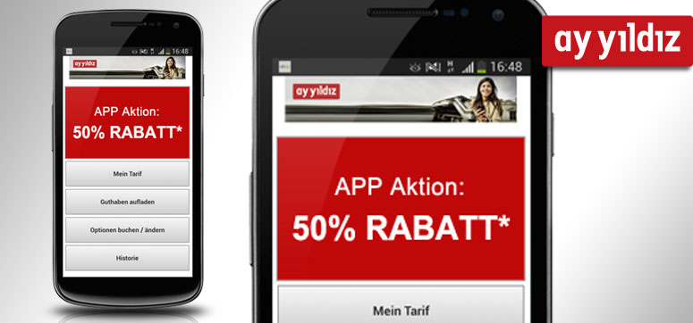 Die leicht zu bedienende App bietet weitere Vorteile, für ein optimales Kundenerlebnis. Mit der App verwalten AY YILDIZ-Kunden besonders einfach von unterwegs ihren Prepaid-Tarif. Die Kunden erhalten nicht nur einen Überblick über den eigenen Prepaid-Guthabenstand und dessen Verbrauch, sondern können über die App ihr Guthaben direkt wieder aufladen und Optionen buchen. Zusätzlich informiert die App über den aktuellen Datenverbrauch und weist auf spezielle Aktionstage hin. Die App benötigt wenig Speicherplatz und lässt sich zweisprachig bedienen ? auf Türkisch oder Deutsch.