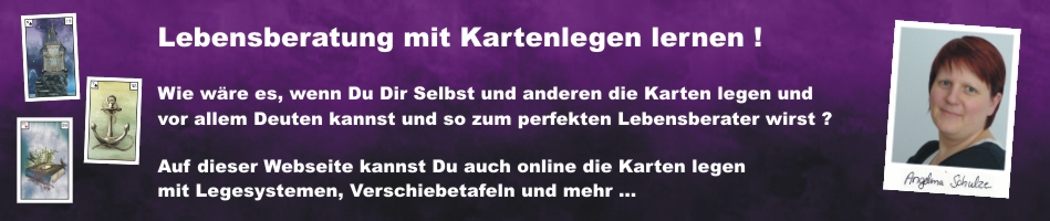 Mit einfachen Schritten zum Erfolg. Diesen Grundsatz vertritt Angelina Schulze. Darum hat sie Lernkarten, Kartendecks, Bücher, CDs, DVDs, PC-Programme, Lernhilfen und Häuserschablonen zum Kartenlegen lernen. 1988 schlug sie begeistert ihren Weg im Bereich Esoterik & Gesundheit ein. Dank vielen Fortbildungen konnte sie 2009 eine eigene Praxis für Lebensberatung, Hypnose und Therapie eröffnen. Sie bietet Seminare und Fernkurse zum Kartenlegen lernen an und als besonderen Service auch Beratungen am Telefon (Kartenlegen).