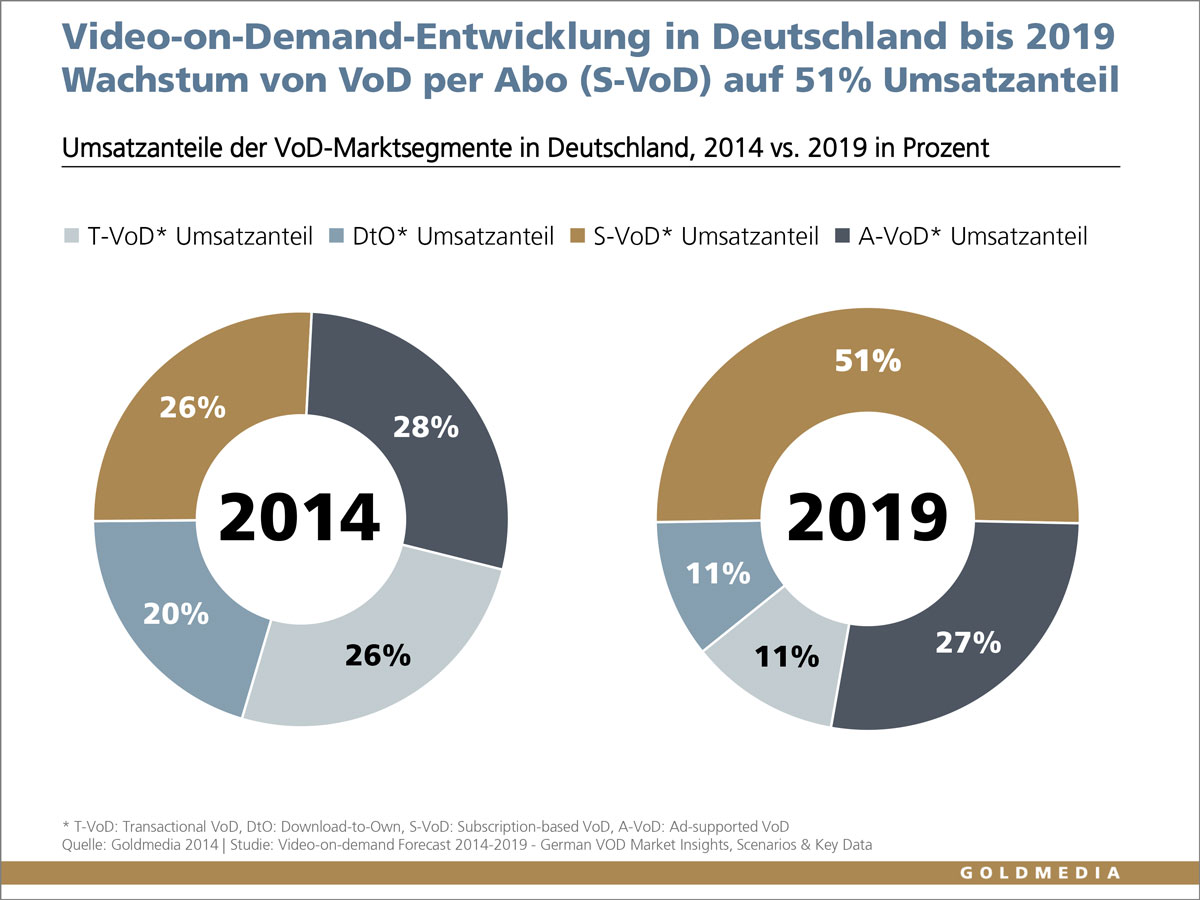 Aktuell agieren in Deutschland rund 50 VoD-Anbieter mit unterschiedlichen Geschäftsmodellen. Bis Ende 2014 erwartet Goldmedia einen Gesamtumsatz von rund 273 Mio. Euro. Eingeschlossen sind in dieser Prognose auch werbefinanzierte Angebote (Ad-supported VoD, A-VoD), die mit einem Anteil von 28 Prozent derzeit den größten Umsatzanteil erwirtschaften und leicht vor Anbietern von S-VoD (Subscription-based bzw. Abonnement VoD) und T-VOD (Transaktionales VoD bzw. Bezahlvideos) liegen mit einem Marktanteil von jeweils 26 Prozent. Das Segment Download-to-Own (DtO) kommt nur auf einen Anteil von rund 20 Prozent.