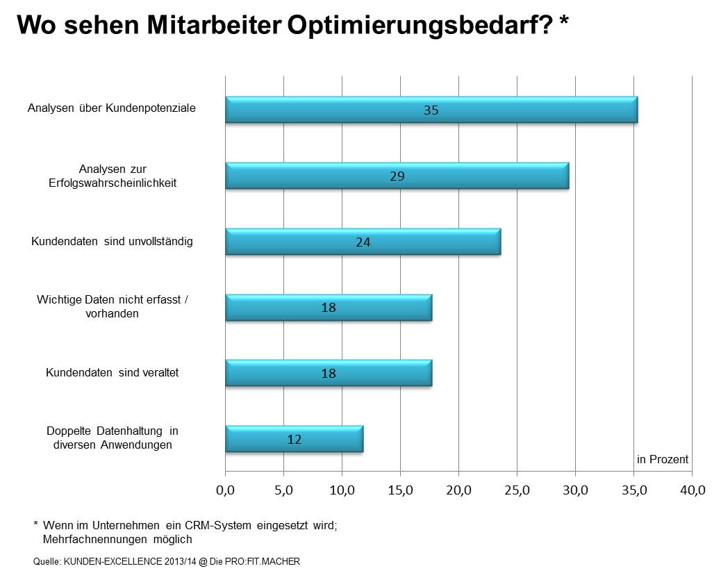 Positive Kundenerlebnisse zu schaffen, und immer wieder schnell auf Veränderungen der Kundenerwartungen zu reagieren ist die neue Herausforderung für Unternehmen. Die Mitarbeiter sehen vor allem Optimierungsbedarf in der Analyse der vorhandenen Kundendaten: 35% bei der Analyse des Kundenpotenzials und 29% bei der Analyse zur Verkaufs-Erfolgswahrscheinlichkeit.