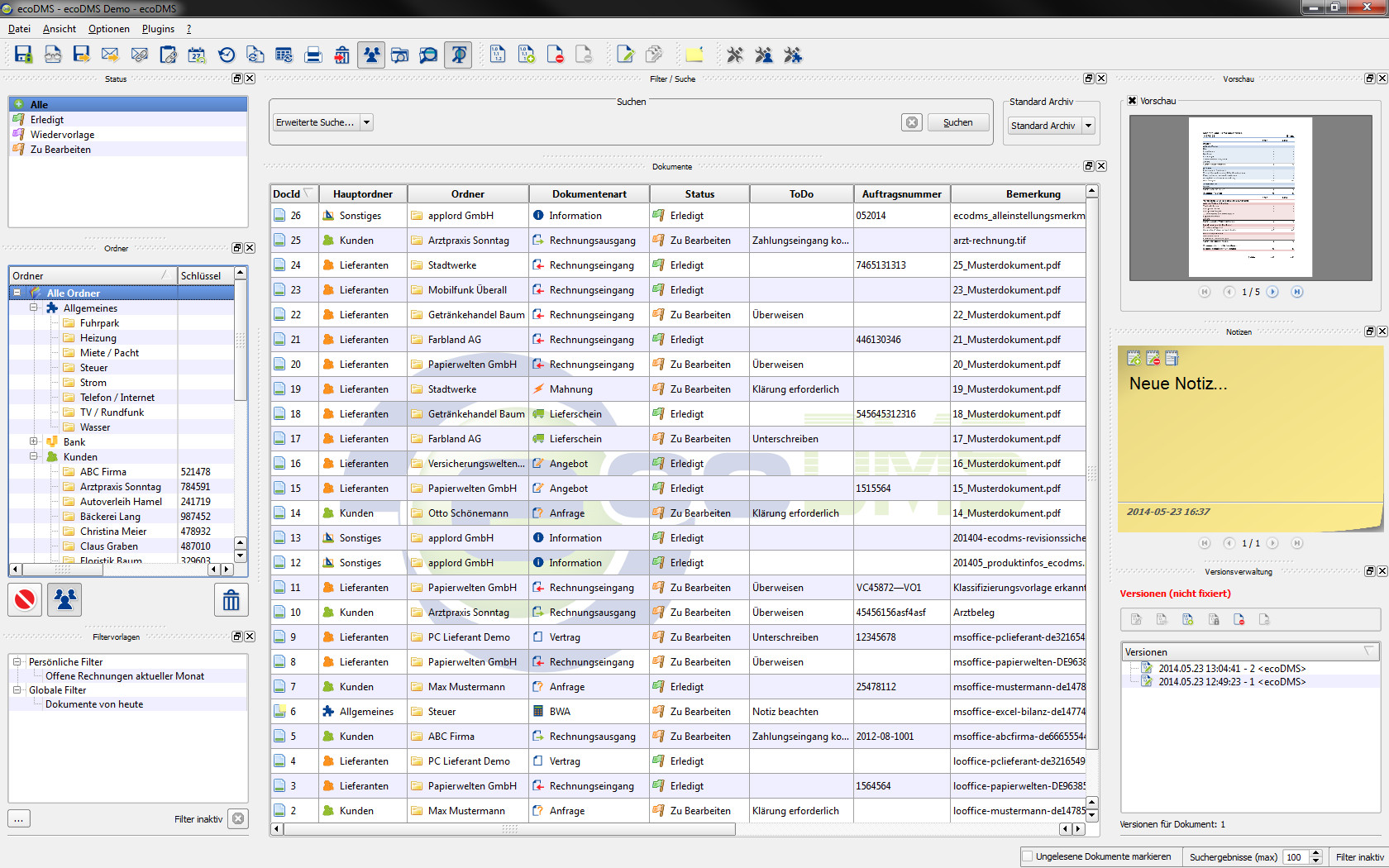 Angefangen von der digitalen Posteingangsbearbeitung und der automatischen Zuordnung, über die gesetzeskonforme Archivierung aller Daten und Informationen, bis hin zum blitzschnellen Wiederfinden der Dokumente und einer einfachen Integration in die bestehende Systemumgebung, bietet ecoDMS jeglichen Komfort für die Anwender. Tausende private und gewerbliche Nutzer haben sich bereits für ecoDMS entschieden und haben so die Dokumentenprozesse deutlich optimieren können.