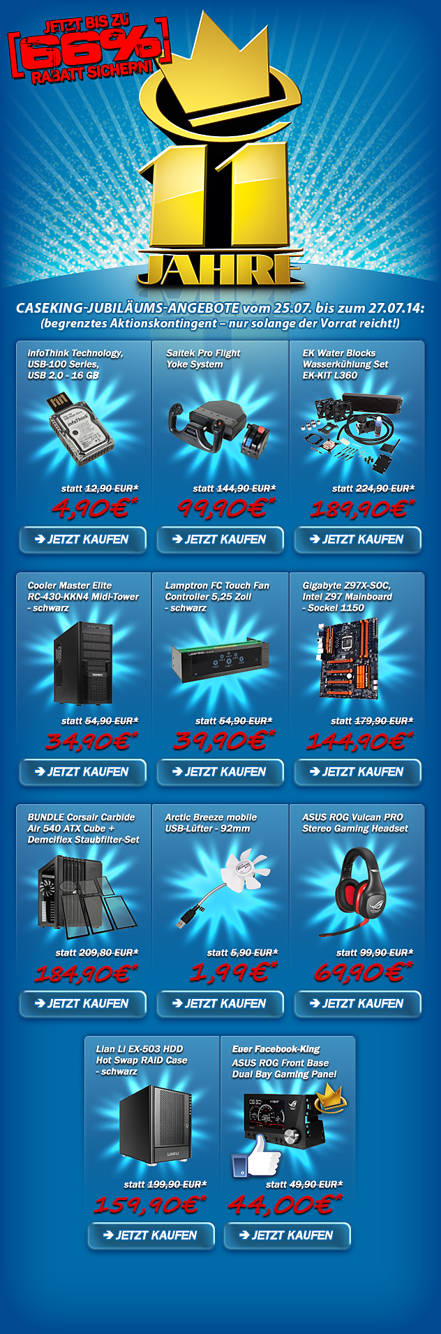 Pro Bestellung kann nur ein rabattiertes Produkt in den Warenkorb gelegt werden. Die Jubiläums-Angebote sind nur am einem bestimmten Wochenende eines jeden Monats im Jahr 2014 gültig und gelten nur, solange der Vorrat reicht. Alle Angebote finden Sie unter www.caseking.de/11jahre!
