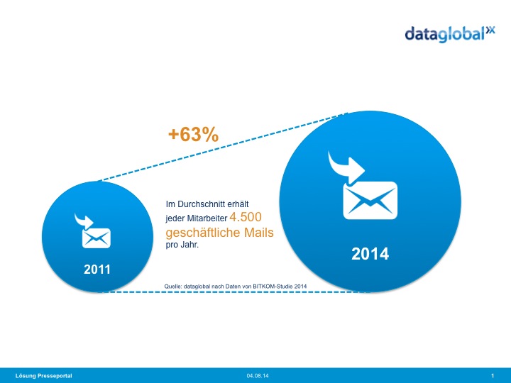 Jeder Mitarbeiter erhält rund 4.500 geschäftliche Mails im Jahr. Wachstum um 63 % seit 2011. Das Volumenwachstum erzeugt unnötige Kosten und auch die Notwendigkeit zur Archivierung steigt. dataglobal zeigt konkreten Ausweg aus der Misere im Webcast auf.