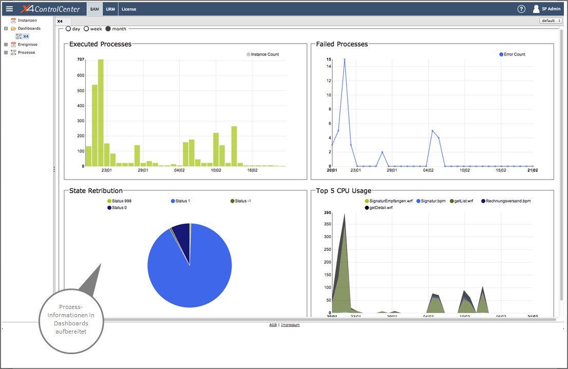 Das X4 ControlCenter beinhaltet alle Module, wie z. B. das Business Activity Monitoring und Funktionen zur Kontrolle von Geschäftsprozessen in Echtzeit