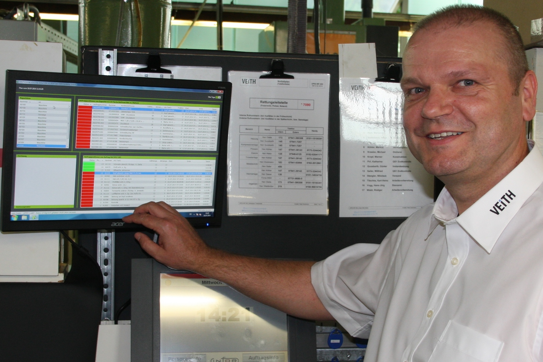 Nun werden etwa dreimal täglich freigegebene Fertigungsaufträge an das MES-System übertragen, um eine automatische Feinplanung durchzuführen. Dabei lassen sich verschiedene Strategien wie zum Beispiel nach optimalen Rüstkosten, höchster Termintreue oder kürzesten Durchlaufzeiten vorgeben. Ergänzend können für einzelne Aufträge individuelle Prioritäten vergeben werden. In einer grafischen Plantafel zieht der Planer einzelne Arbeitsgänge mit der Maus auf neue Arbeitsplätze oder Wochentage. Sofort werden für alle Aufträge sämtliche Konsequenzen aus der veränderten Reihenfolge sichtbar. Die Mitarbeiter in den Fertigungsbereichen werden bei Veith an sieben Infomonitoren über die Terminsituation ihrer Arbeitsgänge informiert und übernehmen eigenverantwortlich die Rüstoptimierung. Die Fertigmeldungen erfolgen über BDE-Terminals.