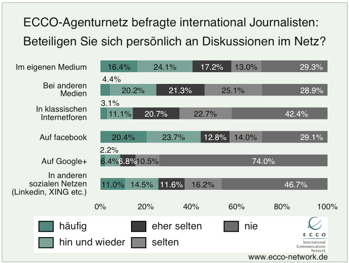 Nur etwas mehr als 40 Prozent der Journalisten beteiligten sich häufig oder hin und wieder an Diskussionen in den Kommentarsektionen des eigenen Mediums. Besonders auffällig ist dabei die Abstinenz der Schweizer Journalisten: Nur knapp 15 Prozent von ihnen suchen den direkten Dialog mit dem Leser. Am aktivsten sind die französischen Kollegen, von denen immerhin etwa 60 Prozent direkt auf Kommentare im eigenen Medium reagieren.