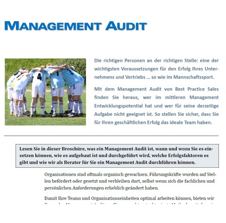 In der Broschüre "Management Audit" (http://bpsales.de/98.html) lesen Sie, was ein Management Audit ist, wann und wozu Sie es einsetzen können, wie es aufgebaut ist und durchgeführt wird. Eie lesen, welche Erfolgsfaktoren es gibt und wie die Berater von Best Practice Sales für Sie ein Management Audit durchführen können. Wir meinen: Lesenswert!