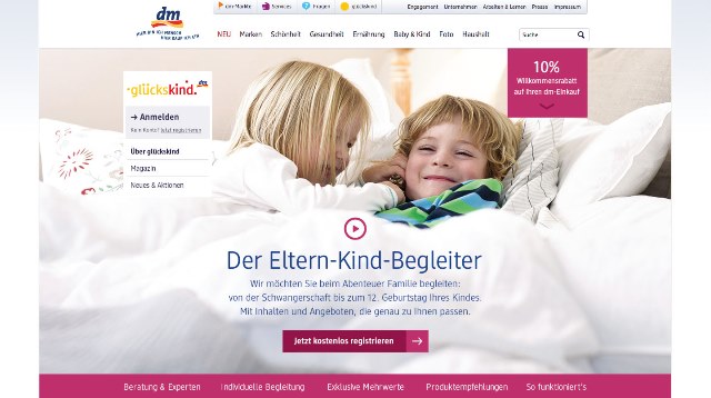 Mit glückskind bringt dm seine Kundenkommunikation auf ein neues Level: Das crossmediale Konzept umfasst die Website, einen speziellen Newsletter und ein Onlinemagazin sowie Kundenmailings, die auf die persönliche Situation bzw. das Alter und die Entwicklung des Kindes abgestimmt sind. Alle Medien ergänzen sich dabei gegenseitig. Durch die zielgerichtete Ausspielung haben die Inhalte und Angebote eine hohe Relevanz für den registrierten Nutzer, die Familien werden individuell begleitet. Die zielgruppenspezifische Ansprache macht der Kunden-Login auf www.dm.de/glückskind möglich. Hier können sich Eltern mit ihren Kindern registrieren, wobei sie auch das Alter der Kinder angeben. So spielt beispielsweise das Onlinemagazin, das viele Beiträge von Experten, Fachleuten und Redakteuren rund um das Thema Familie enthält, nur den Content aus, der auf die aktuelle Familiensituation genau zugeschnitten ist. Neben dem Onlinemagazin werden fortlaufend interaktive Onlinespiele, Gewinnspiele, Produktempfehlungen, Beratungsvideos, Coupons und Geschenke zur Verfügung gestellt. Des Weiteren haben Eltern die Möglichkeit, sich unter redaktionellen Inhalten über die Kommentarfunktion auszutauschen und ihre eigenen Erfahrungen zu teilen. Über den Login der Eltern können außerdem die Kinder auf werbefreie und kindgerecht aufbereitete Inhalte, wie interaktive Spiele, Quiz, Bastelanleitungen oder Geschichten, zugreifen. Kinder setzen sich dabei spielerisch mit Familie, Haushalt, Hygiene und Umwelt auseinander.