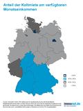 Im Bundesdurchschnitt zeigt sich ein weniger angespanntes Verhältnis zwischen Einkünften und Mietausgaben: So verfügen die Deutschen monatlich über rund 1.750 Euro, wovon sie knapp 530 Euro für die Kaltmiete ihrer Wohnung aufbringen müssen. Dies ergibt einen Anteil von 30 Prozent am Monatseinkommen und bestätigt somit die altbekannte Regel.