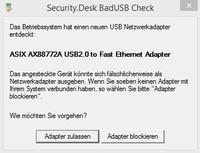 Die Software Security.Desk kontrolliert USB-Eingabegeräte (Tastatur und Maus) sowie Netzwerkadapter, die an den PC angeschlossen werden. Ist das Gerät bereits bekannt und als ungefährlich bestätigt, so wird es automatisch zugelassen. Sollte es sich jedoch um ein unbekanntes Gerät handeln, so erscheint ein Dialogfeld, das auf das neu entdeckte Gerät hinweist. Wird dieses vom Nutzer akzeptiert, so speichert Security.Desk die Freigabe ab. Sollte es sich jedoch um einen manipulierten USB Stick handeln, der sich z.B. als Tastatur oder Maus ausgibt, dann kann dieser direkt vom User blockiert werden.