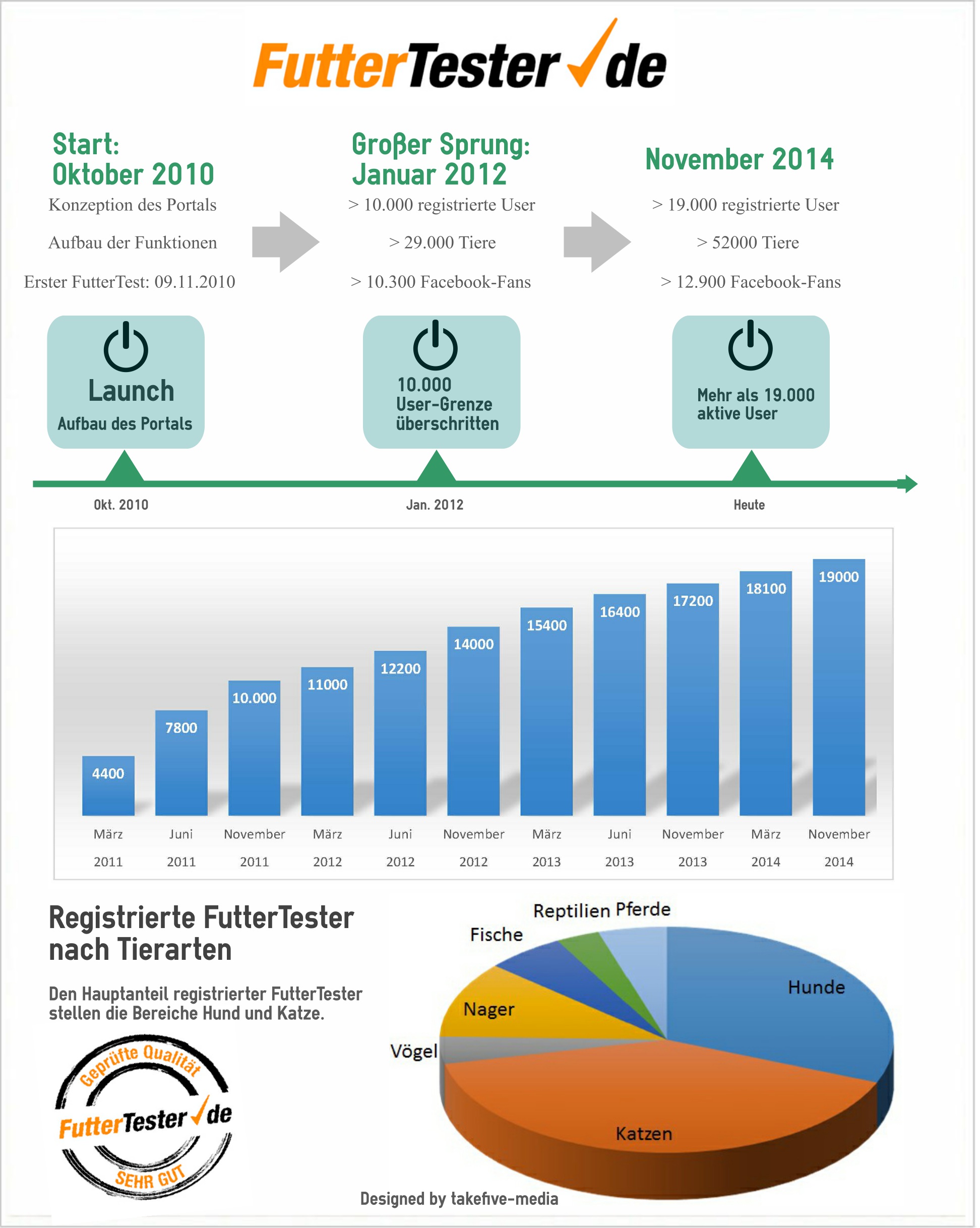 FutterTester ist eine kostenfreie Bewertungsplattform für Endverbraucher. Die Idee besteht darin, dass Heimtierbesitzer ihre Meinung über Futtermittel, Snacks und weitere Heimtierprodukte äußern und sich darüber austauschen können. Denn, so der Grundgedanke, sie sind die Experten, wenn es um die richtige Ernährung ihres Heimtieres geht. Dadurch prägen sie die Diskussion rund um bedarfs- und artgerechte Tiernahrung. Zugleich erhalten Hersteller wichtige Hinweise, worauf Tierfreunde besonderen Wert legen. Seit dem Start im Oktober 2010 hat sich FutterTester schnell zu einem unabhängigen Test- und Empfehlungsportal von Verbrauchern für Verbraucher entwickelt. Inzwischen sind mehr als 19.000 Heimtierfreunde mit über 52.000 Tieren registriert und auf Facebook verfolgen 12.000 Fans Neuigkeiten rund um getestete Produkte.