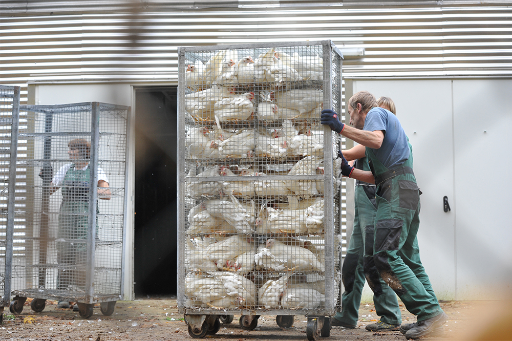 Jan Peifer, Gründer des Deutschen Tierschutzbüros e.V., war vor Ort und berichtet: "Aus einer Halle wurden nach und nach Gitterwagen, voll beladen mit jungen Hühnern, herausgerollt. Die Tiere waren so eng zusammengepfercht, dass sie keine normale Körperhaltung einnehmen konnten. Dutzende Hühner mussten hilflos mit massiv verrenkten Hälsen und Beinen ausharren, das muss für die Tiere äußerst schmerzhaft gewesen sein."