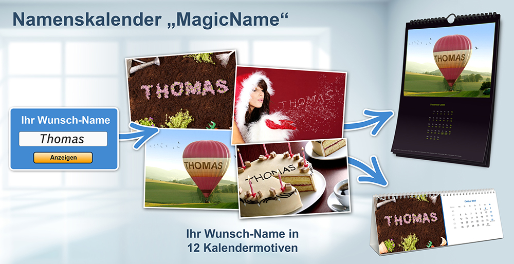 Wenn der eigene Name plötzlich gut lesbar auf allen zwölf Kalenderseiten im Bild erscheint, wird der Jahreskalender zu einem echten Hingucker. Eine perfekte Illusion in Fotoqualität. Doch wie geht das genau? Wie von Zauberhand wird der gewünschte Text auf Knopfdruck in die MagicName® Motive von www.PrintPlanet.de integriert. Im Namenskalender verschmelzen so Bildmotive mit dem Namen des Betrachters. Dahinter steckt eine intelligente Software für Bildpersonalisierungen.