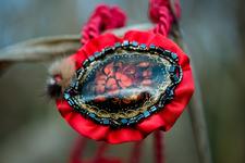 Der Zufall wollte es, dass sie beim Sortieren der Sachen ihrer Mutter auf eine alte, russische Lackbrosche stieß. Für sie war sofort klar, dass ihre Tochter diese als Andenken tragen solle, jedoch in neuer, individueller Art und Weise. Daraufhin entschloss sie sich, die Brosche völlig neu zu gestalten.