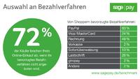 72 Prozent der befragten Online-Shopper bestätigten, dass sie einen Einkauf abbrechen, wenn das von ihnen bevorzugte Bezahlverfahren nicht angeboten wird. Die beliebtesten Zahlungsarten bei Kunden sind PayPal, Rechnung, Lastschrift und Kreditkarte.