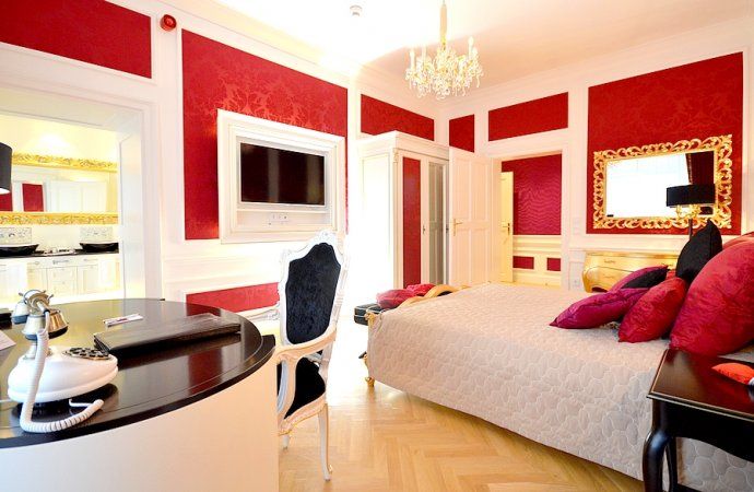 Schönbrunn zählt zu den bedeutendsten und meistbesuchten Kulturgütern. Dennoch bleibt die Privatsphäre in der Suite gänzlich unberührt, so dass die imperiale Einrichtung alleinig vom Mieter genossen werden kann. Gold, Schwarz und Weiß sind die vorherrschenden Farben, kombiniert mit edlen Hölzern. Natürlich darf auch der bekannte Hofdamast nicht fehlen, ein roter Stoff, bei dem man zunächst eine eingewebte Ananas zu erkennen glaubt - die sich jedoch bei genauem Hinsehen als Pinienzapfen entpuppt.