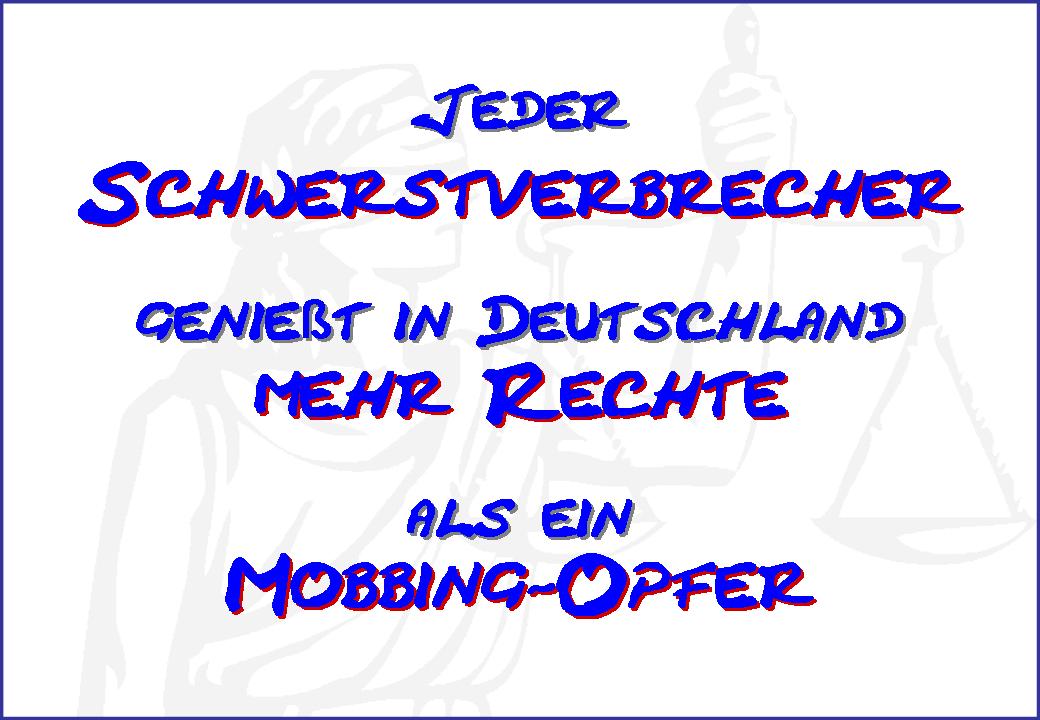Mindestens seit dem Jahre 2000 fordern Mobbing-Opfer daher immer wieder die Schaffung eines Gesetzes gegen Mobbing ? mindestens seit dem Jahre 2000 werden diese Forderungen immer wieder mit demselben Wortlaut abgelehnt: ?Es gebe bereits genügend rechtliche Möglichkeiten, sich gegen Mobbing zu wehren.? (Tätigkeitsbericht des Petitionsausschusses aus dem Jahre 2000, S. 17/18 + Öffentliche Korrespondenz unter www.mobbing.ilia-faye.de). Diese Aussage wurde anhand konkreter Beispiele längst widerlegt.