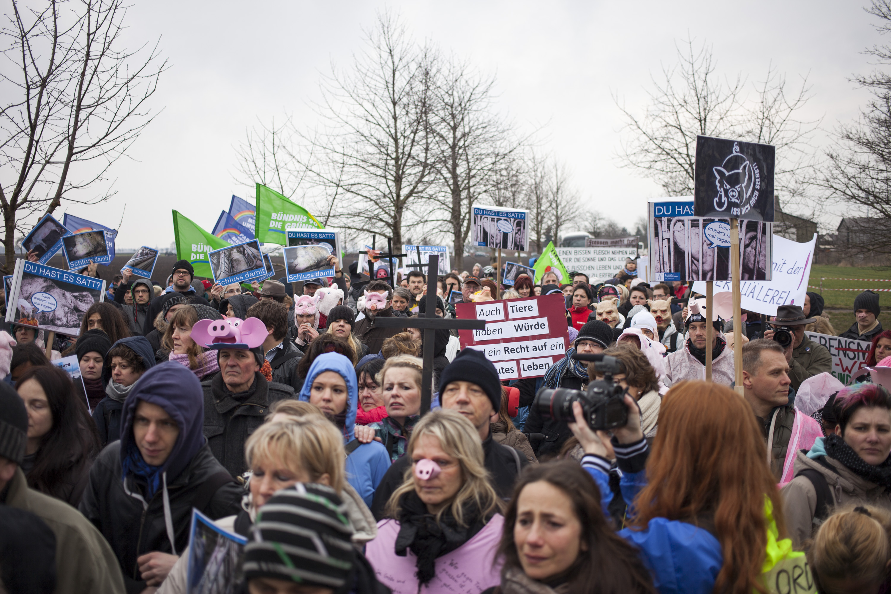 Hunderte Tierschützer demonstrierten für Schließung des Schweinehochhauses