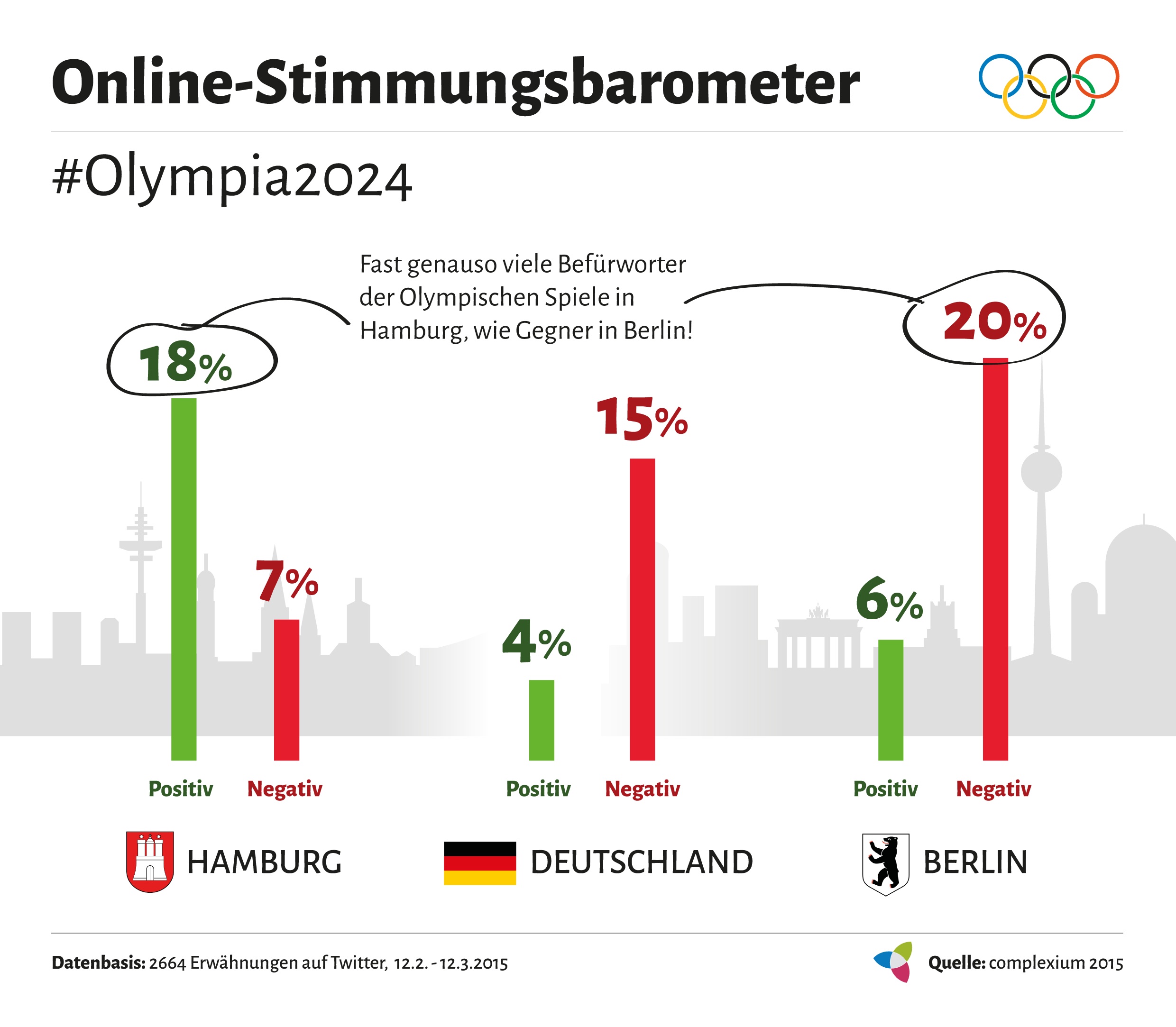 Die Twitter-Auswertung im Zeitraum 12.02. bis 12.03.2015 unter 2.664 Twitter-Erwähnungen (Mehrfachnennungen möglich) der Social-Web-Unternehmensberatung complexium ergab, dass die deutsche Online-Community die Austragung der olympischen Sommerspiele im Jahr 2024 weder in Berlin noch Hamburg zur Mehrheit unterstützt. Müsste jedoch eine Stadt gewinnen, so wäre es nach der Meinung der deutschen Twitter-User zu 18% Hamburg und nur zu 6% Berlin. Hier scheint der Vorentscheid die Realität widerzuspiegeln. Doch: Selbst für Hamburg sind 18% Gesamtzustimmung, als eher pessimistischer Ausblick zu bewerten.