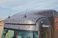 "Die Aerodynamikforschung am Optifuel Lab 2 betraf den gesamten Sattelzug, also Sattelzugmaschine und Auflieger," erklärt Claude Covo weiter. "Wir haben uns um eine perfekte Harmonie zwischen den beiden Bestandteilen bemüht, um den Perleffekt zu erzeugen, den Luftwiderstand und damit auch den Verbrauch zu reduzieren." Der mobile Dachspoiler, der sich bei Fahrzeugstillstand öffnet, um das Fahrerhaus besser vor Wärme zu schützen, wird ab 50 km/h automatisch eingeklappt. Damit entsteht eine perfekte Kontinuität mit dem Auflieger. Weiter verstärkt wird der Perleffekt durch die gewölbte Dachform, die 70 cm großen Seitenspoiler im Heckbereich und die Seitenverkleidungen des Aufliegers. Außerdem wurden die Rückspiegel und der Frontspiegel durch profilierte Kameras ersetzt, um den Luftstrom nicht zu unterbrechen.
