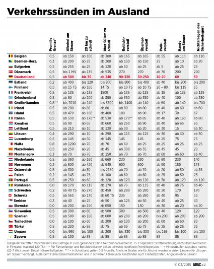 ADAC die Wichtigsten in einer Tabelle zusammengestellt.