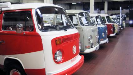 sieht sich bei VW in Hannover um, wo über 100 Kult-Bullis stehen und