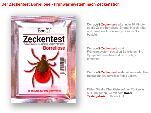 Zeckenschnelltest.com oder Zeckentest Borreliose bestellt oder in Apotheken unter Angabe der PZN: 6059738 gekauft werden.