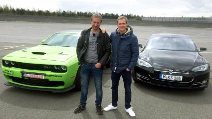 im Tesla treten zu diesem heißen Duell der Autowelten an. Kann der