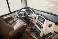 Für ein großzügiges Raumgefühl im Wohnbereich sorgen die Hängeschränke mit gebogenen Fronten, die sich unten Richtung Außenwand neigen. Dazu kommt der enorme Lichteinfall durch das großflächige Panorama-Glasdach. Abends sorgen energiesparende LED-Spots für eine individuelle, angenehme Ausleuchtung. Dazu wurden die Baldachine verändert, damit die Strahler die Schrankpartien optimal illuminieren. Neu für die anstehende Saison ist der 32-Zoll-Flachbildschirm, der seitlich aus dem Oberschrank herabsenkbar ist.