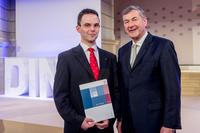 Bildunterschrift: Dr. Holger Dörr vom Prüflaboratorium Gas der DVGW-Forschungsstelle am Engler-Bunte-Institut des Karlsruher Instituts für Technologie erhält den DIN-Preis ?Best Practice? von Dr. Torsten Bahke, Vorsitzender des Vorstandes von DIN.
