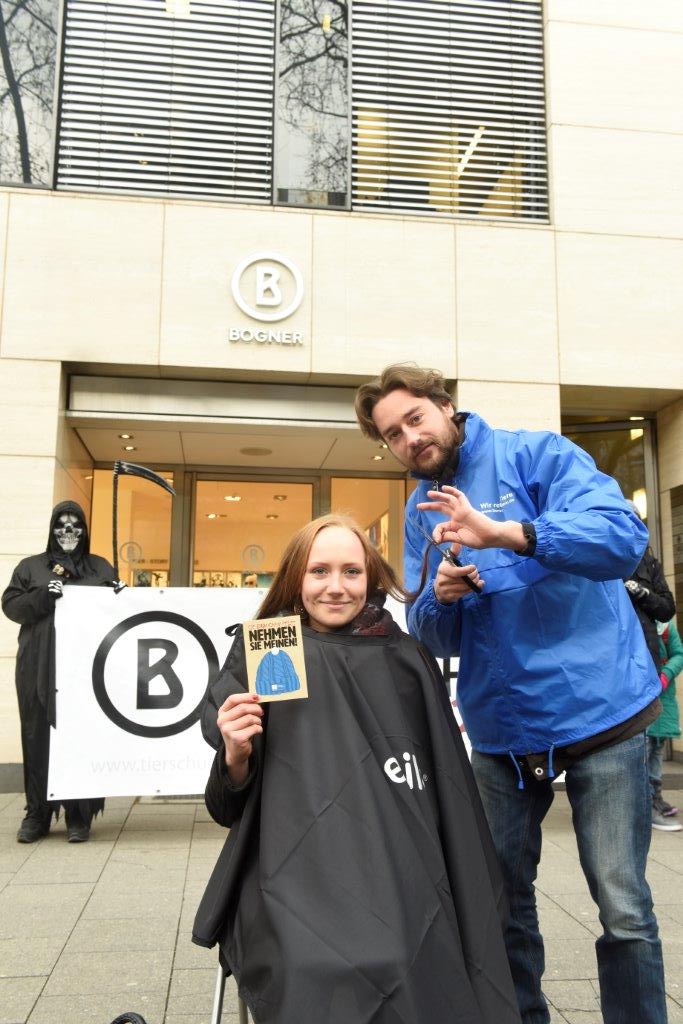 "Haarschneide-Aktion" vor Berliner Bogner-Filiale zur Anti-Pelz-Kampagne
