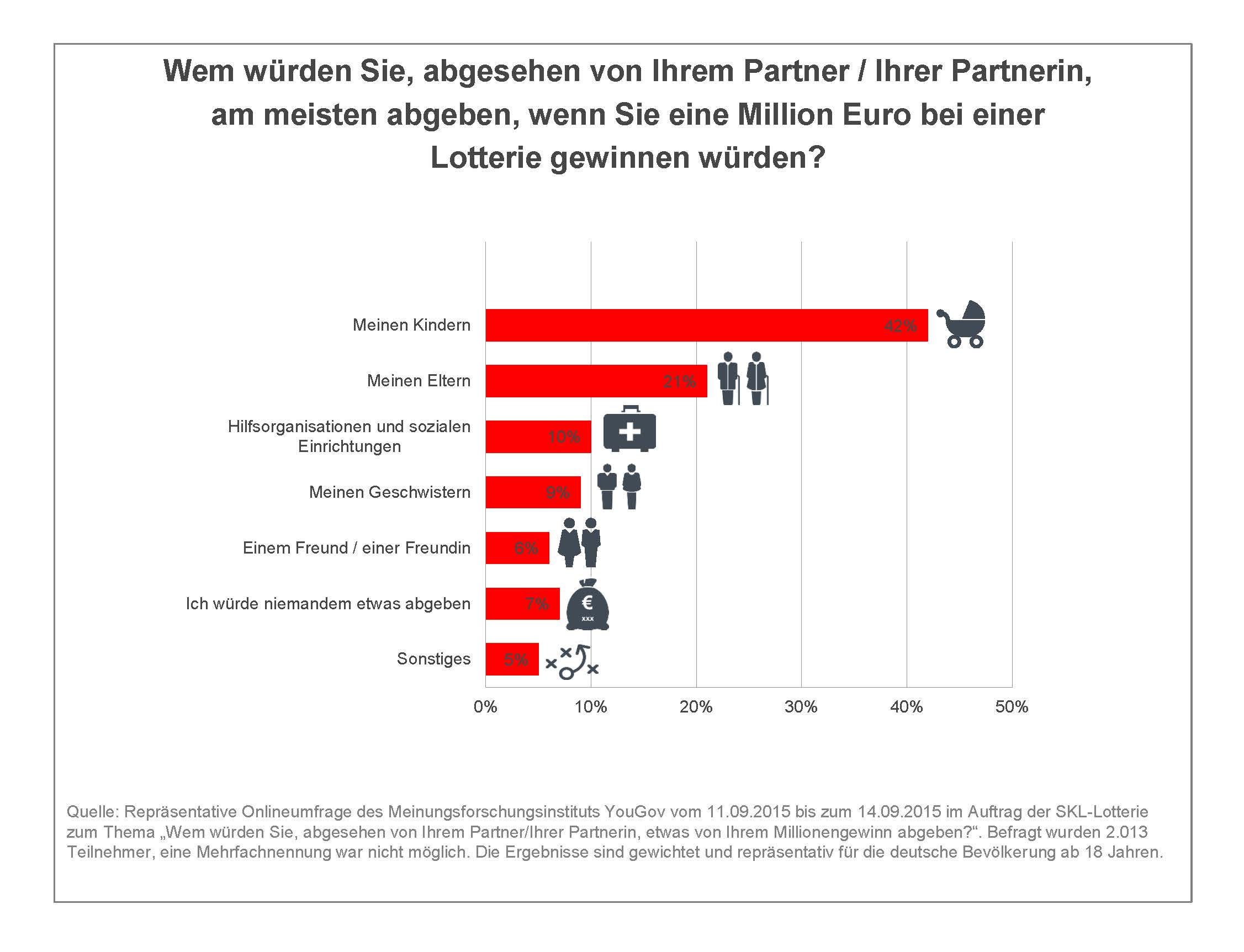 Dass die Deutschen gerne geben, das haben nicht erst die freiwillige Hilfe und die Spendenfreudigkeit für Flüchtlinge gezeigt. Diese Haltung unterstreicht auch die repräsentative Umfrage, die das Marktforschungsinstitut YouGov anlässlich des Starts der 138. SKL-Lotterie durchführte. Im September wurde via Internet 2.013 Personen die Frage gestellt: "Wem würden Sie, abgesehen von Ihrem Partner oder Ihrer Partnerin, am meisten von einem Millionengewinn abgeben?" Die Kinder und die Eltern - sie bekommen bei den meisten ein Stück Glück ab. 42 Prozent der Befragten möchten in erster Linie den Kindern etwas abgeben und 21 Prozent den Eltern. Das finanzielle Glück größtenteils mit Freunden teilen wollen sechs Prozent, es ganz für sich behalten hingegen lediglich sieben Prozent.