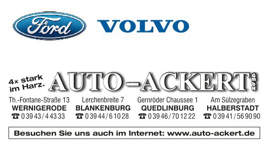 Rund um im Harz ist das Unternehmen Auto-Ackert GmbH mit vier Filialen vertreten. Die Betriebe von Auto Ackert sind in Wernigerode, Halberstadt, Blankenburg und Quedlinburg langjährig verlässliche Partner rund ums Fahrzeug. Im Mittelpunkt bei Neuwagen steht die Marke Ford: Als Vertragshändler können die Ackert-Betriebe die neuesten Modelle stets direkt zum Marktstart anbieten.
