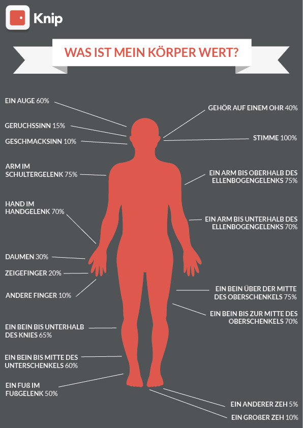 Besonders schwerwiegend und folgenreich können Unfälle mit Feuerwerkskörpern sein. Einschränkung der Hörfähigkeit, schwere Gesichtsverletzungen, Verbrennungen oder gar der Verlust von Gliedmaßen können die Folge sein. In diesen Fällen greift die private Unfallversicherung. Die Versicherungssumme wird nach dem Unfall einmalig ausgezahlt und berechnet sich je nach Invaliditätsgrad. In der sogenannten Gliedertaxe sind Körperteilen und Sinnesorganen bestimmte Prozentsätze zugeordnet. Ein Bein ist zum Beispiel mit 70 Prozent bewertet. Umgerechnet bedeute das: Beträgt die Versicherungssumme 100.000 Euro, erhält der Betroffene bei voller Funktionsunfähigkeit 70.000 Euro. Da jede Versicherungsgesellschaft mit unterschiedlichen Prozentsätzen rechnet, hat Knip die Durchnittswerte eines jeden Körperteils in einer Infografik zusammengestellt.