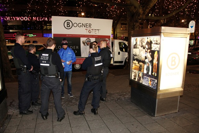 "Polizeieinsatz: Plakat-Wagen vor Berliner Bogner-Filiale sorgt für Aufregung
