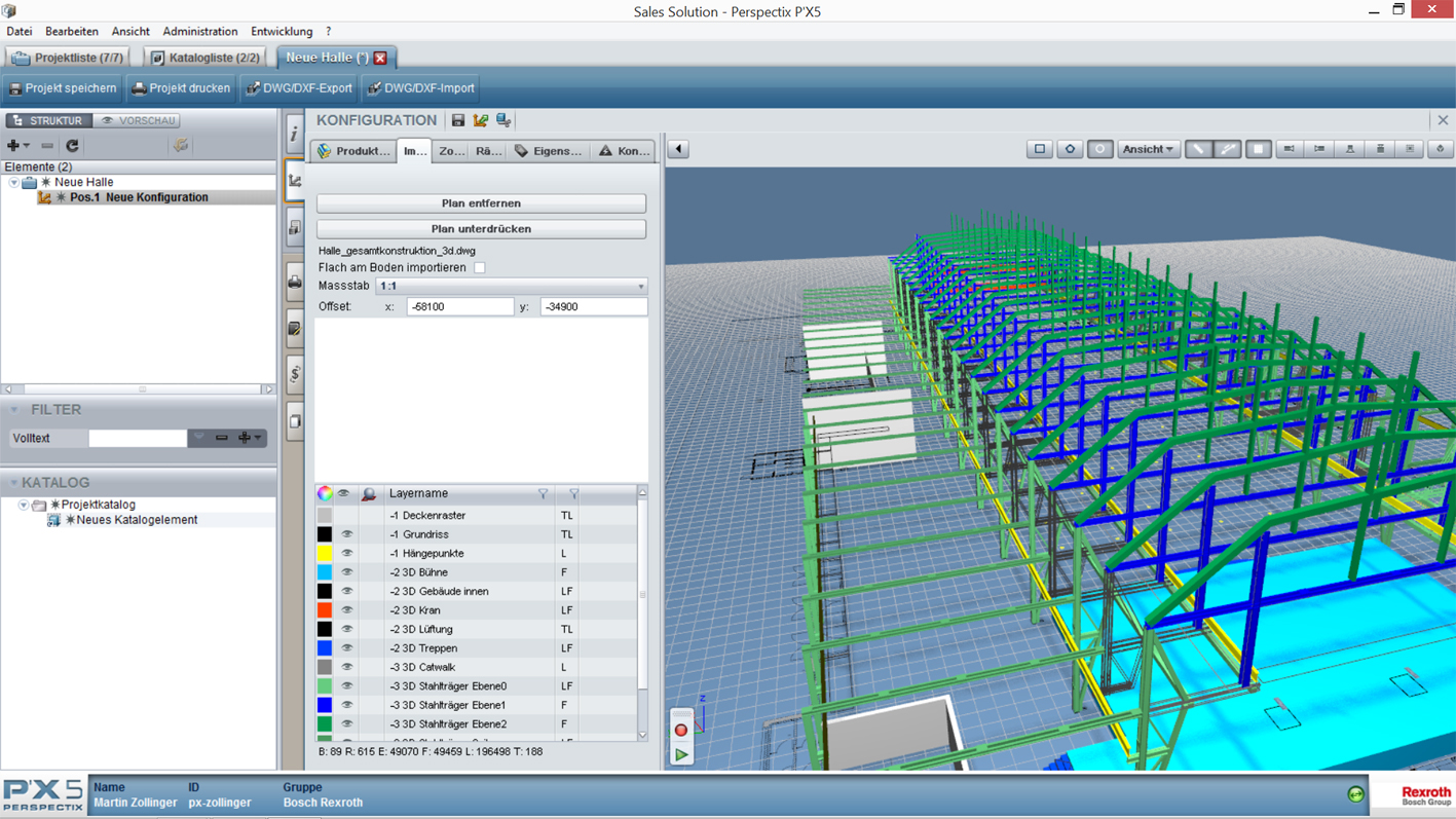 Die Sales Solution P''X5 von der Perspectix AG unterstützt die Anwender mit CRM-Funktionalitäten, die speziell auf die Anforderungen des Projektgeschäfts zugeschnitten sind. Zugleich bietet die Software einen grafisch-interaktiven Konfigurator, mit dem sich unabhängig von Konstruktion und Produktentwicklung, regelbasiert Produktvarianten erzeugen und realistisch präsentieren lassen. Ob klassischer Außendienst, Online-Kunden oder Vertriebspartner im internationalen Geschäft - mit der Funktionalität lassen sich komplexe technische Produkte regelbasiert aus 3D-Daten konfigurieren. Stücklisten und Produktkalkulationen werden mitgeführt, so dass jedes regelgerecht konfigurierte Projekt vollständig verkaufsfähig beschrieben wird. Dadurch werden Anfragen schneller und treffsicherer beantwortet, Prozesskosten gesenkt und der Angebotsdurchsatz erhöht. Konstruktion und Produktentwicklung werden nicht mehr mit der Ausarbeitung von Möglichkeiten belastet, sondern nur noch eingebunden, um Spezialfälle zu bearbeiten. Alle für das Regelwerk und die Produktbeschreibungen des Konfigurators notwendigen Stammdaten werden aus den PLM-Quellsystemen bezogen. Das definierte und zentral gepflegte Regelwerk verbindet funktionale Abhängigkeiten, räumliche Mindestabstände oder gesetzliche Bestimmungen. Dadurch entfällt von vornherein das Spezifikationsrisiko. Animierbare 3D-Darstellungen helfen dabei, komplexe Sachverhalte und Abläufe zu erläutern.