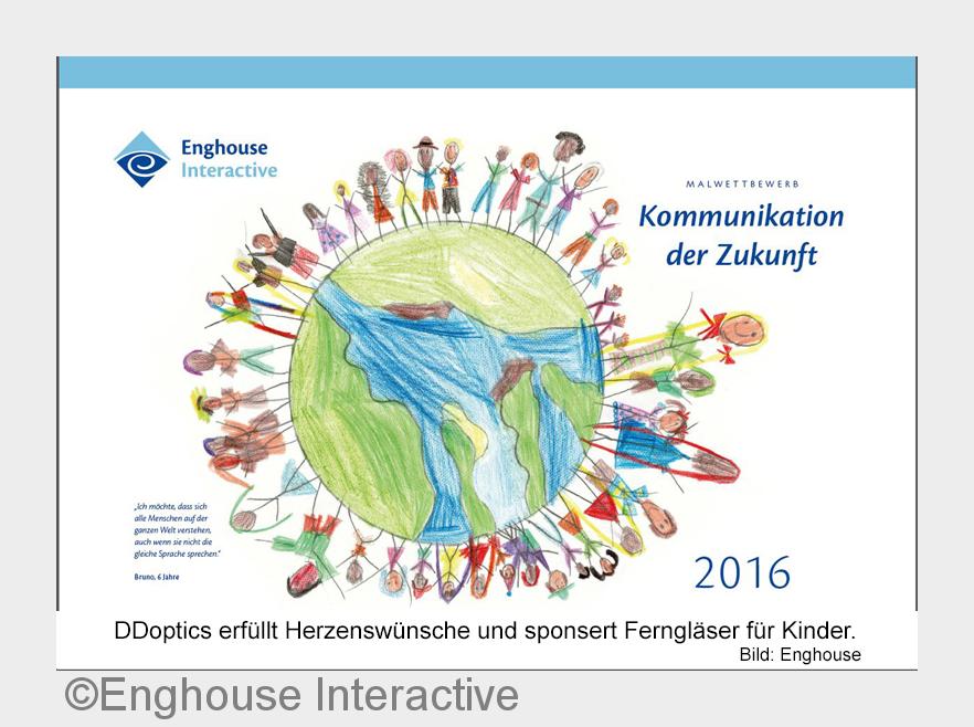 Unter dem Motto "Kommunikation der Zukunft" hatte Enghouse Interactive einen Malwettbewerb für Kinder ausgeschrieben. Eine Jury unter Leitung des Kika-Moderators Alex Huth wählte aus den Einsendungen die besten 13 Motive aus, die für die Gestaltung eines Jahreskalenders für 2016 verwendet wurden. Den Kinder winkten im Rahmen des Malwettbewerbs attraktive Preise, u.a. hochwertige Ferngläser der Reihe "Ultralight" von DDoptics.