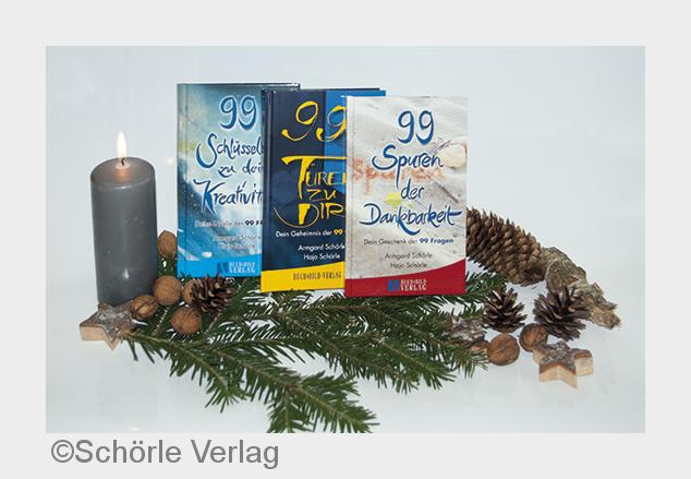 Fragenbücher: Schon bei "99 Wege zur Dankbarkeit" wurde das Fragekonzept und die Buchreihe geboren. In diesem Jahr war Schörle zur Präsentation seiner Buchkunst sogar in Brüssel beim Börsenverein des dt. Buchhandels eingeladen worden. Beim Wettbewerb von Ecobookstore wurde die Rezension von "99 Schlüssel zu deiner Kreativität" sogar auf Platz 1 gewählt. Darin heißt es. "Dieses Buch erschafft Raum und Zeit" . Und das sind die beiden Voraussetzungen, um in Kontakt zu seinem Inneren Ich zu kommen. Aber auch, um besinnliche Weihnachten zu feiern. Denn dies lädt sich und andere ein in die Welt der Gedanken, der eigenen Gedanken.