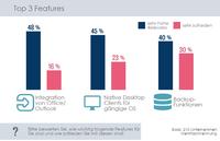 Ebenfalls herrscht bei weiteren als wichtig angesehenen Funktionen keine überzeugende Zufriedenheit: Mit der Integration von Office/Outlook, einem für fast die Hälfte der Unternehmen sehr wichtigen Feature, sind nur 16 Prozent der befragten Unternehmen sehr zufrieden. Auch die ebenfalls als wichtig erachteten nativen Clients für gängige Betriebssysteme werden nur von weniger als einem Viertel der Unternehmen als sehr zufriedenstellend angesehen. Weiterhin wurde die Usability von mobilen Clients schlechter bewertet als jene der Desktop-Varianten. Die Unternehmen sollen daher bei der Wahl der richtigen Filesharing-Lösung ein besonderes Augenmerk auf die Mobilitätseigenschaften werfen.