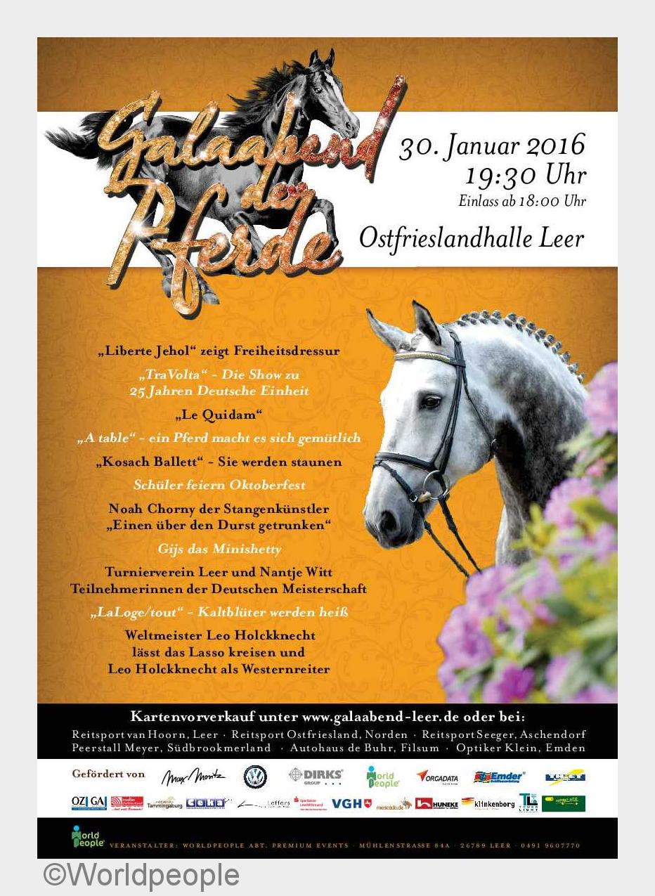 Sich einen Abend eine Auszeit vom Alltag nehmen, komplett eintauchen in eine Welt fernab des Tageseinerleis und mal wieder so richtig mit allen Sinnen genießen - dafür eignet sich der Galaabend der Pferde perfekt. Jedes Jahr strömen mehrere Tausend Besucher in die Leeraner Ostfrieslandlandhalle, um sich vier Stunden lang ausgezeichnet unterhalten zu lassen - und zwar nicht nur mit beeindruckenden Pferdedressuren, sondern mit zahlreichen aufregenden Showacts und einem bunt gemischten Rahmenprogramm, das alle Altersklassen begeistert! Im letzten Jahr ließ beispielsweise eine Lasershow beim Galaabend der Pferde die Münder vieler offen stehen - und beim demnächst anstehenden Event des Personaldienstleisters Worldpeople darf man sich auf ein ähnliches Spektakel freuen!